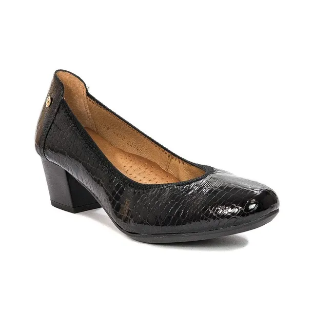 Klasyka i nowoczesny design – tak można określić nową propozycję marki Maciejka. W naszym internetowym sklepie MIDIAMO prezentujemy piękne, eleganckie i niezwykle kobiece czółenka tej znanej marki. Cholewka uszyta z naturalnej, lakierowanej skóry z motywem gada w klasycznym, czarnym kolorze, wykończona czarną obwódką. Usztywniony zapiętek zapobiega deformacji obuwia i pozwala utrzymać stopy we właściwej pozycji. Dzięki wyściółce ze skóry i dobrze wyprofilowanej skórzanej wkładce podklejonej miękką pianką, odczuwamy wysoki komfort użytkowania. Niewysoki, stabilny obcas w naturalny sposób wysmukla nogę i stanowi solidną podstawę dla całej sylwetki. Na zewnętrznej stronie pięty delikatne logo marki. Piękne, wygodne i ponadczasowe. Idealne do sukienki, spódniczki, ale także do spodni.