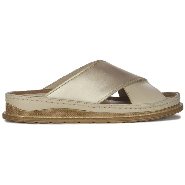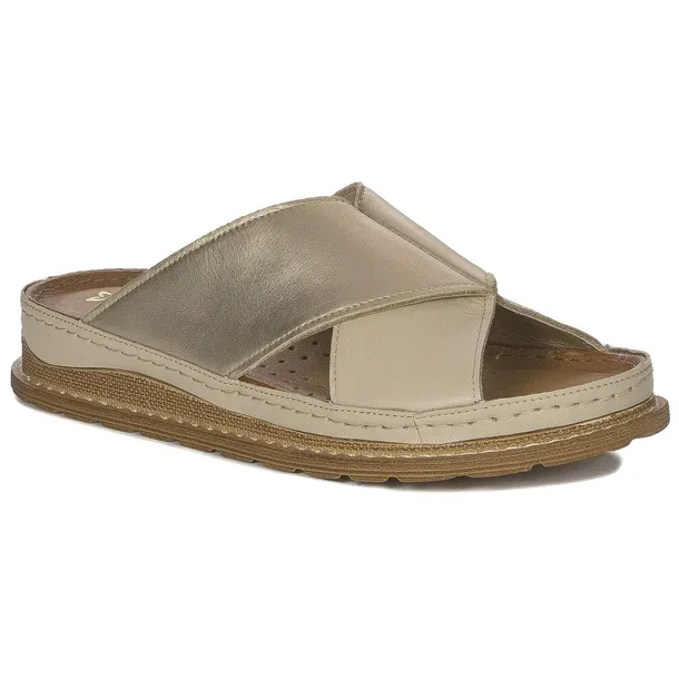 Prezentowany model, eleganckie, bardzo wygodne klapki damskie renomowanej polskiej marki Maciejka to absolutny niezbędnik w garderobie każdej kobiety. Cholewka została wykonana z wysokiej jakości skóry naturalnej w kolorze beżowym oraz złotym. Miękka skórzana wkładka oraz przyjazna dla stopy podszewka gwarantują wysoki komfort codziennego użytkowania. Model z otwartym, okrągłym noskiem, na płaskiej podeszwie o wysokości max. 3 cm. Klapki są bardzo lekkie i pięknie prezentują się na nogach. Dla pań w każdym wieku i do wielu stylizacji. Jakość: I. Wyprodukowano w Polsce.
