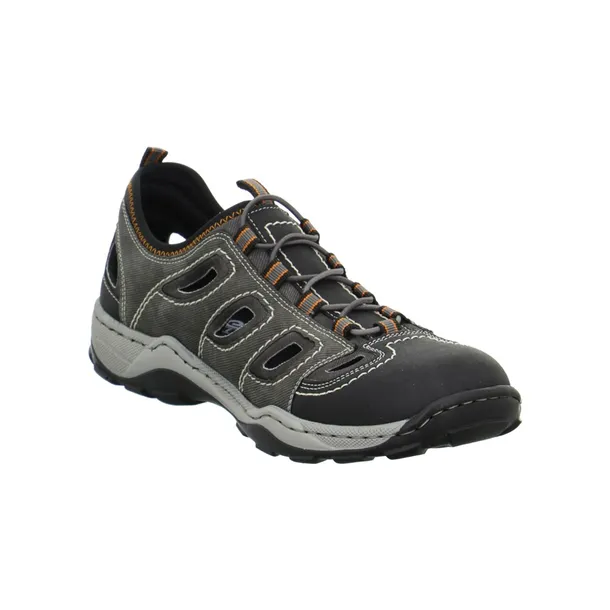 Sportowe, modne męskie półbuty/sneakery marki RIEKER w kolorze szarym. Szczegóły takie jak połączenie materiałów, modne wycięcia i delikatne, kontrastujące kolorystycznie ozdobne szwy podkreślają modny, sportowy design. Te kapcie są wygodne w noszeniu dzięki systemowi Rieker ANTIstress, który sprawia, że buty są lżejsze i bardziej elastyczne, zapewniają więcej miejsca i zapewniają optymalną amortyzację.