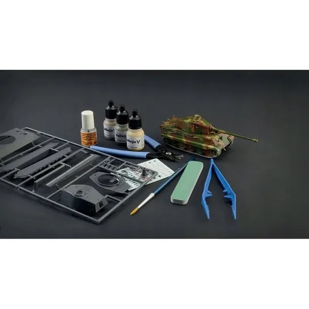 Zestaw zawiera farby, pędzelek, narzędzia i klej