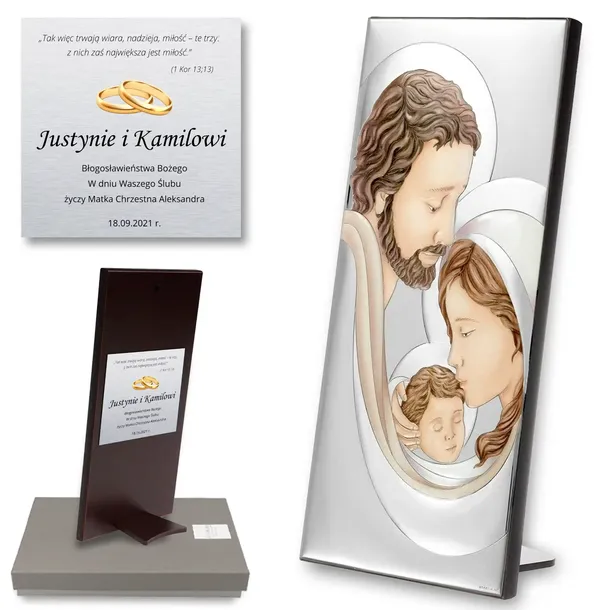 Znalezienie właściwego prezentu na ślub może być nie lada wyzwaniem. Prezent powinien być wyjątkowy, wartościowy, a przede wszystkim - powinien przekazać Twoje szczere życzenia dla Pary Młodej. Dlatego proponujemy Ci Obrazek Srebrny na Ślub - Święta Rodzina Kolorowy z Grawerem - prawdziwy skarb, który zadowoli najbardziej wymagające gusta.