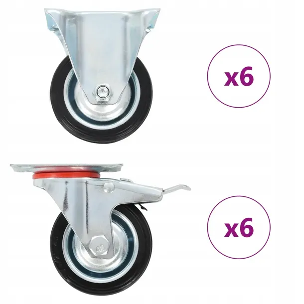 - Przesyłka obejmuje 6 kółek nieskrętnych i 6 kółek skrętnych z hamulcami