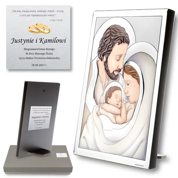 Szukasz wyjątkowego prezentu na ślub dla Pary Młodej? Ten ekskluzywny srebrny obrazek przedstawiający Świętą Rodzinę z możliwością personalizacji graweru może być idealnym wyborem.