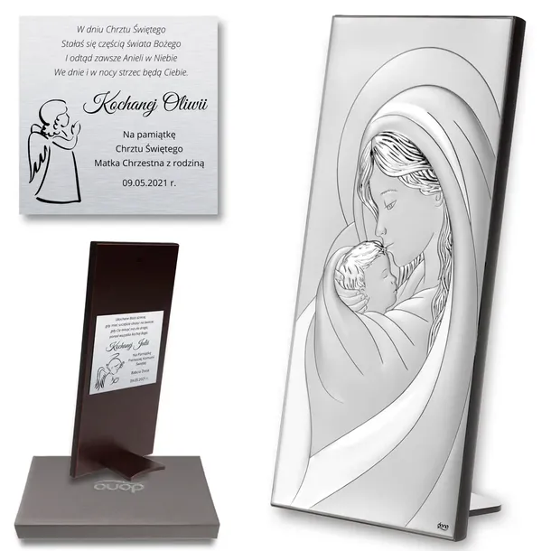 Przedstawiamy Państwu srebrny obrazek przedstawiający Matkę Bożą z Dzieciątkiem. Jest to obrazek prostokątny, pokryty całościowo srebrem i umieszczony na drewnianej płytce. Do obrazka jest dołączona podpórka, dzięki której obrazek możemy postawić. A jeżeli wolisz, obrazek możemy także powiesić na ścianie.Wysokiej Jakości Obrazek na Wyjątkowe Chwile