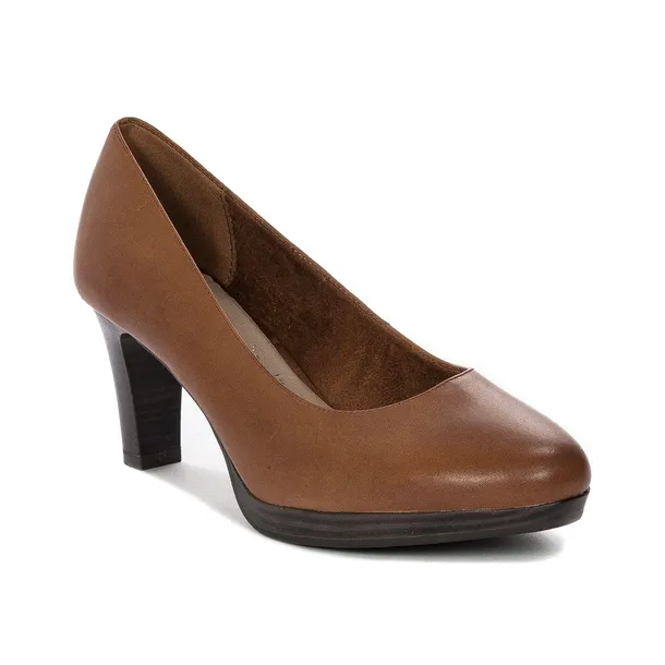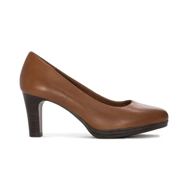 Tamaris symbolizuje oczekiwania modowe każdej świadomej kobiety. Prezentowany model to klasyczne czółenka damskie z naturalnej, licowej skóry w kolorze brązowym Cognac, miękko przylegającej do stopy. W prezentowanym modelu znalazł zastosowanie system antishock. Umieszcza się go zazwyczaj w obcasach. Jego zadaniem jest redukcja wstrząsów i znaczna poprawa komfortu chodzenia bez nadmiernego obciążenia kręgosłupa. Okrągły, lekko migdałowy, smukły nosek nadaje modelowi niezwykłej elegancji. Wygodna, profilowana wkładka podklejona miękką pianką daje duże poczucie wygody i komfortu. Obcas w kształcie słupka w połączeniu z dość grubą - 1,3 cm podeszwą jest bardzo stabilny i stanowi solidną podstawę dla całej sylwetki. Piękna linia cholewki wraz z obcasem w naturalny sposób wysmukla nogę i nadaje stylizacji eleganckiego charakteru. Idealne do biura, ale także na wieczorne spotkania.