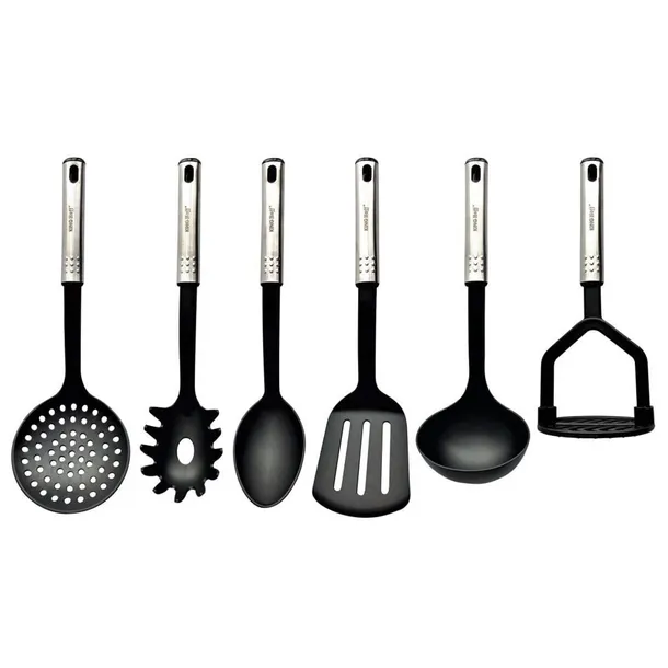 Zestaw przyborów kuchennych wykonanych ze stali i nylonu termoplastycznego. Przybory dedykowane do naczyń z powłokami teflonowymi i ceramicznymi wrażliwymi na zarysowania. W zestawie stojak, który umożliwi przechowywanie ich w porządku a przybory będą zawsze w zasięgu ręki.