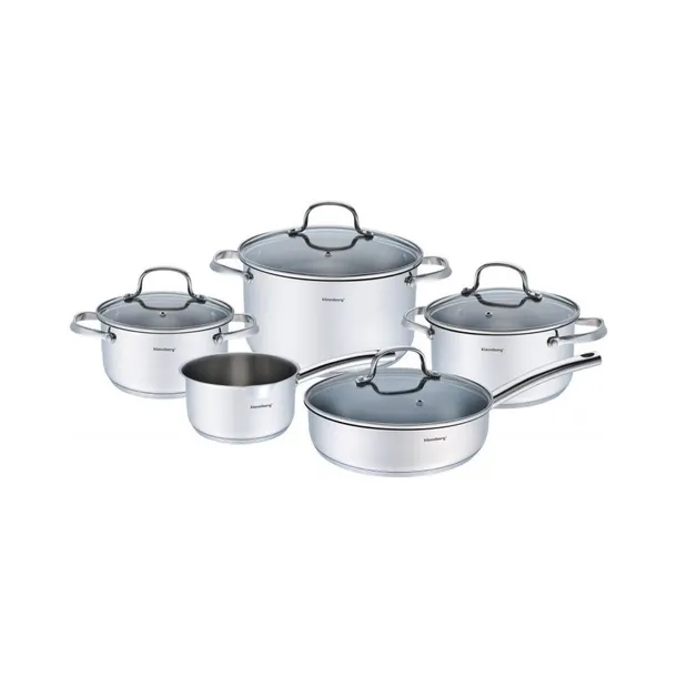 Wspaniały, 9-częściowy komplet garnków wysokiej jakości. Zestaw wykonany z najwyższej jakości stali nierdzewnej 18/10. Stal tego typu gwarantuje długą żywotność zestawu i odporność na powstawanie plamek i przebarwień. Patelnia z nieprzywieralną powłoką marmurkową. Produkt renomowanej marki KLAUSBERG.
