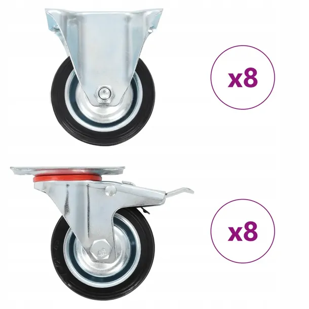 - Przesyłka obejmuje 8 kółek nieskrętnych i 8 kółek skrętnych z hamulcami