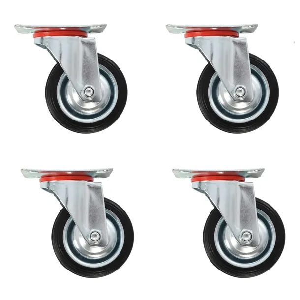 Kółka zostały wykonane z gumy, która wyróżnia się dobrą odpornością na wstrząsy i wibracje, zapewniając płynną i cichą jazdę. Dodatkowo ich miękka powierzchnia skutecznie chroni podłogę przed zarysowaniem. Żelazna, ocynkowana rama jest wysoce odporna na rdzę, co zwiększa wytrzymałość i trwałość kółek. Maksymalna nośność każdego kółka wynosi 50 kg.