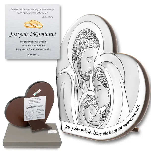 Przedstawiamy obrazek w kształcie serca, na którym znajduje się symboliczny napis: „Jest jedna miłość, która nie liczy na wzajemność”. Obrazek przedstawia Świętą Rodzinę, a całość pokryta jest srebrem najwyższej jakości. Dołączona podpórka umożliwia jego postawienie, a specjalny otwór pozwala na umieszczenie go na ścianie.