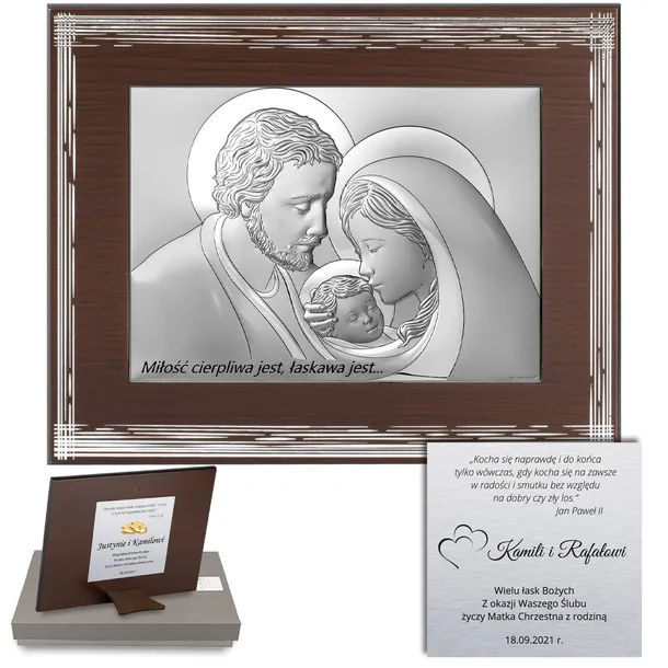 Srebrny obrazek włoskiej produkcji przedstawiający Świętą Rodzinę. Srebrny obrazek włoskiej produkcji umieszczony na ciemnym drewnianym panelu przedstawiający Świętą Rodzinę. Poziomy z matowym tłem oraz napisem "Miłość cierpliwa jest, łaskawa jest..." co sprawia że będzie on idealnym prezentem lub pamiątką z okazji Ślubu czy Rocznicy Ślubu.Obraz stworzony jest przez firmę a wszystkie ozdobne elementy na panelu wykonane są ze srebra.