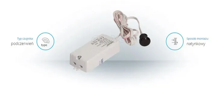 Czujnik załącza obwód elektryczny w momencie zarejestrowania ruchu ręki z odległości 5-6 cm. Urządzenie służyć do oświetlenia luster, szafek itp. Współpracuje z oświetleniem LED-owym