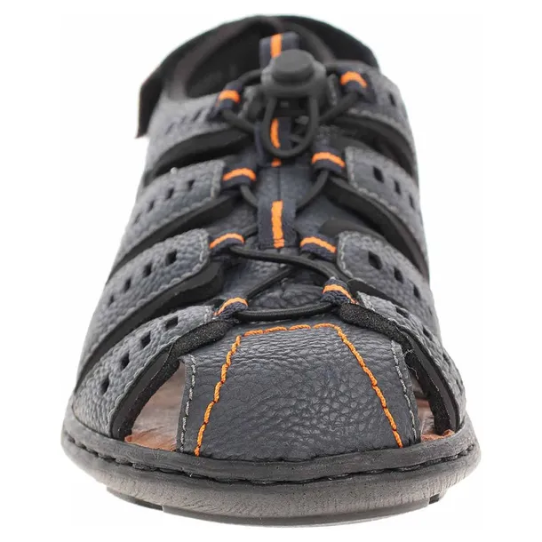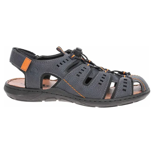 Sandały męskie marki Rieker to świetna propozycja dla osób, które cenią sobie komfort i wygodę, jak i styl. Takim obuwiem może się pochwalić marka Rieker, która wychodzi na przeciw oczekiwaniom najbardziej wymagającym gustom potencjalnych Klientów. Prezentowany model to najnowsza propozycja na nadchodzący sezon wiosna-lato. Cholewka klasycznym granatowym kolorze została wykonana z wysokogatunkowego tworzywa i tkaniny. Wkładka to skóra naturalna, a reszta wnętrza to miękka i przyjemna w dotyku tkanina. Płaska podeszwa z obcasem o wysokości 3 cm. Model zapinany na rzep, wiązany dodatkowo na gumki ściągające ze stoperem. Wysokość podeszwy z przodu to około 1,5 cm. Całość wykonana z dużą dbałością o szczegóły. Lekkie i bardzo wygodne dla Panów w każdym wieku i pasujące na wiele okazji.