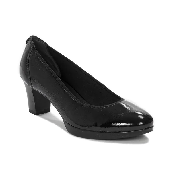 Tamaris symbolizuje oczekiwania modowe świadomej jakości i kosztów kobiety. Prezentowany model to klasyczne, czarne czółenka z naturalnej, lakierowanej skóry, miękko przylegającej do stopy. W prezentowanym modelu znalazł zastosowanie system TouchIt. Umieszcza się go zazwyczaj we wkładce. Jego zadaniem jest redukcja wstrząsów i znaczna poprawa komfortu chodzenia bez nadmiernego obciążenia kręgosłupa. Okrągły, lekko migdałowy nosek nadaje modelowi niezwykłej elegancji. Wygodna, profilowana wkładka ze skóry naturalnej podklejona miękką pianką daje duże poczucie wygody i komfortu. Obcas w kształcie słupka jest bardzo stabilny i stanowi solidną podstawę dla całej sylwetki. Piękna linia cholewki wraz z obcasem w naturalny sposób wysmukla nogę i nadaje stylizacji eleganckiego charakteru. Idealne do biura, ale także na wieczorne spotkania.