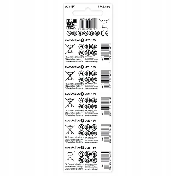 Oferowana cena dotyczy kompletu 5 szt. baterii 23A / A23 12V everActive.