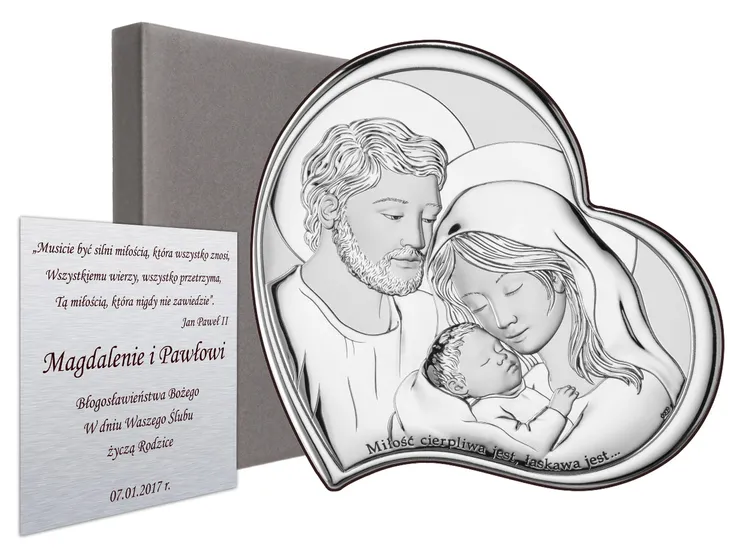 Ekskluzywny srebrny obrazek, marki , włoskiego producenta srebrnych wyrobów pamiątkarskich. Obrazek w kształcie serduszka przedstawia Świętą Rodzinę. Na dole obrazka znajduje się napis "Miłość cierpliwa jest, łaskawa jest..." Taki obrazek to wyjątkowy prezent lub pamiątka na specjalną okazję jaką jest zawarcie Sakramentu Małżeństwa, lub z okazji Rocznicy Ślubu.