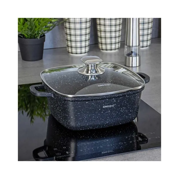 Odlewany kwadratowy garnek żaroodporny z powłoką marmurkową, umożliwiającą zdrowe gotowanie.