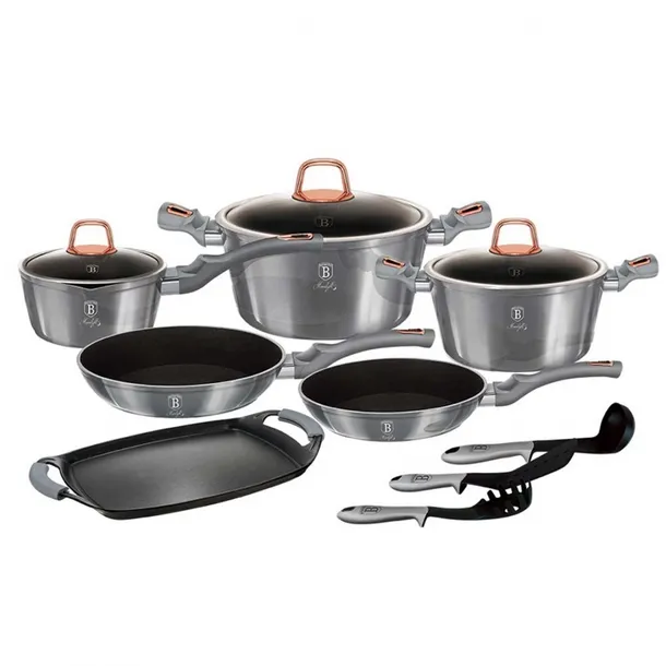 Garnki i patelnie z serii METALLIC firmy BERLINGERHAUS wykonane są z wysokiej klasy kutego aluminium pokrytego wewnątrz potrójną powłoką granitową (marble) o bardzo wysokim współczynniku twardości. Powłoka zewnętrzna występuje w kilku wersjach kolorystycznych o charakterystycznym metalicznym połysku. Te atrakcyjne i modne naczynia wyposażone są standardowo w uchwyty typu SOFT TOUCH (silikon handle). Przystosowane do wszystkich rodzajów kuchenek: gazowa, elektryczna, ceramiczna, halogenowa, indukcyjna. System TURBO INDUCTION (bardzo szybko nagrzewają się) pozwala zaoszczędzić nawet 35% energii.