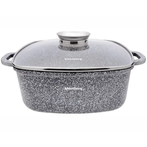 Odlewany, alumioniowy kwadratowy garnek żaroodporny z ceramiczną powłoką marmurkową, umożliwiającą zdrowe gotowanie.