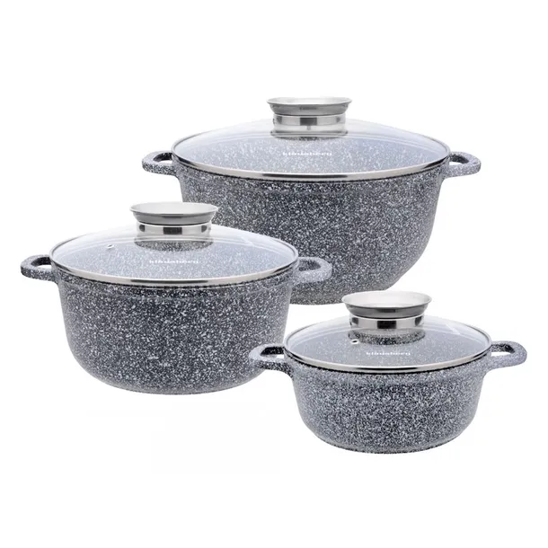 Zestaw odlewanych z aluminium garnków z ceramiczną, żaroodporną powłoką marmurkową, umożliwiającą zdrowe gotowanie.