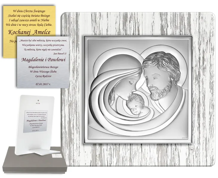 Ekskluzywny srebrny obrazek włoskiej produkcji, stworzony przez firmę , wiodącego producenta wyrobów pamiątkarskich ze srebra. Obrazek przedstawia Świętą Rodzinę. Całość umieszczona jest na panelu imitującym jasne drzewo. Stanowi on wyjątkowy prezent lub pamiątkę na specjalną okazję jaką jest Ślub, Chrzest Święty, Pierwsza Komunia lub z okazji narodzin dziecka.