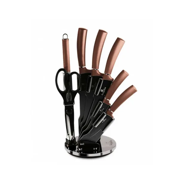 8 elementowy zestaw noży na stojaku firmy BERLINGER HAUS z serii Rose Gold. Przeznaczone do porcjowania mięsa i ryb, krojenia pieczywa oraz obierania i siekania warzyw. Noże ze stali nierdzewnej dodatkowo pokryte powłoką nieprzywierającą non-stick. Wyposażone w uchwyty pokryte bardzo trwałą cienką warstwą antypoślizgową dla uzyskania pewnego trzymania w każdych warunkach.