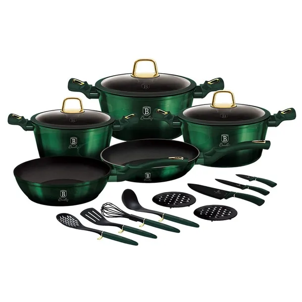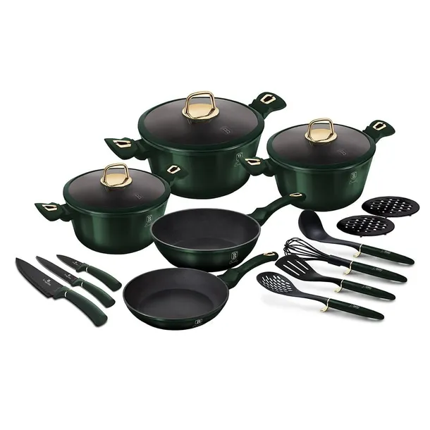 ZESTAW GARNKÓW I PATELNI BERLINGER HAUS EMERALD 17 elementów. W zestawie przybory kuchenne.