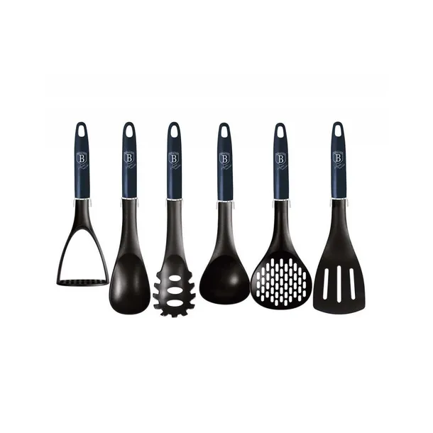 7 elementowy zestaw nylonowych przyborów kuchennych firmy BERLINGER HAUS z linii Aquamarine Metallic Collection z praktycznym wieszakiem ściennym. Przybory polecane szczególnie do naczyń z powłokami ceramicznymi i teflonowymi. Materiał z którego są wykonane nie rysuje powierzchni naczyń. Jest odporny na wysoką temperaturę do 210 stopni C. Posiada szczególne właściwości antybakteryjne.