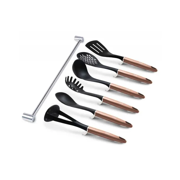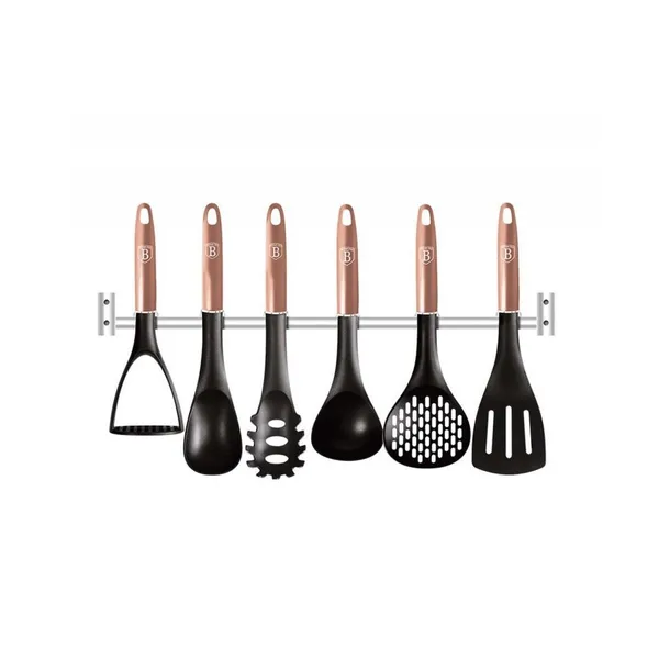 7 elementowy zestaw nylonowych przyborów kuchennych firmy BERLINGER HAUS z linii Rose Gold Collection z praktycznym wieszakiem ściennym. Przybory polecane szczególnie do naczyń z powłokami ceramicznymi i teflonowymi. Materiał z którego są wykonane nie rysuje powierzchni naczyń. Jest odporny na wysoką temperaturę do 210 stopni C. Posiada szczególne właściwości antybakteryjne.