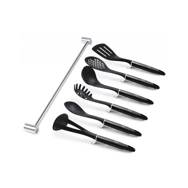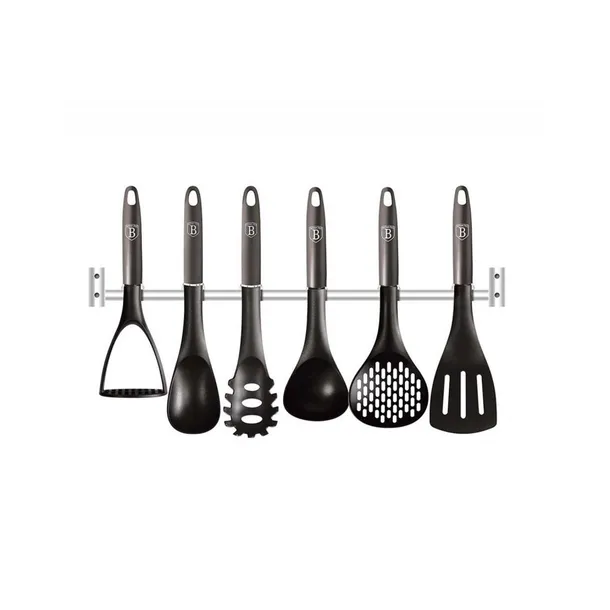 7 elementowy zestaw nylonowych przyborów kuchennych firmy BERLINGER HAUS z linii Carbon Pro Collection z praktycznym wieszakiem ściennym. Przybory polecane szczególnie do naczyń z powłokami ceramicznymi i teflonowymi. Materiał z którego są wykonane nie rysuje powierzchni naczyń. Jest odporny na wysoką temperaturę do 210 stopni C. Posiada szczególne właściwości antybakteryjne.