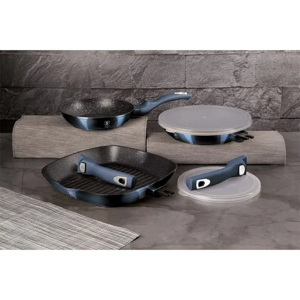 Naczynia z serii AQUAMARINE EDITION firmy BERLINGER HAUS wykonane są z wysokiej klasy odlewanego aluminium pokrytego wewnątrz potrójną powłoką granitową (marble) o bardzo wysokim współczynniku twardości. Powłoka zewnętrzna w kolorze metalicznym grafitowym. Te atrakcyjne i modne naczynia wyposażone są standardowo w uchwyty typu SOFT TOUCH (silikon handle). Przystosowane do wszystkich rodzajów kuchenek: gazowa, elektryczna, ceramiczna, halogenowa, indukcyjna. System TURBO INDUCTION (bardzo szybko nagrzewają się) pozwala zaoszczędzić nawet 35% energii.W komplecie:
