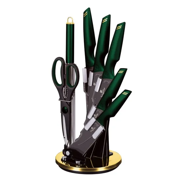 9 elementowy zestaw noży na stojaku firmy BERLINGER HAUS z serii Emerald Collection. Przeznaczone do porcjowania mięsa i ryb, krojenia pieczywa oraz obierania i siekania warzyw. Noże ze stali nierdzewnej dodatkowo pokryte powłoką nieprzywierającą non-stick. Wyposażone w uchwyty pokryte bardzo trwałą cienką warstwą antypoślizgową dla uzyskania pewnego trzymania w każdych warunkach.