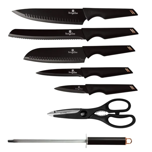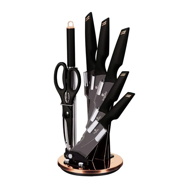 9 elementowy zestaw noży na stojaku firmy BERLINGER HAUS z serii Black Rose Collection. Przeznaczone do porcjowania mięsa i ryb, krojenia pieczywa oraz obierania i siekania warzyw. Noże ze stali nierdzewnej dodatkowo pokryte powłoką nieprzywierającą non-stick. Wyposażone w uchwyty pokryte bardzo trwałą cienką warstwą antypoślizgową dla uzyskania pewnego trzymania w każdych warunkach.