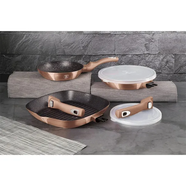Garnki i akcesoria z serii Rose Gold Edition firmy BERLINGER HAUS wykonane są z wysokiej klasy kutego aluminium pokrytego wewnątrz potrójną powłoką granitową o bardzo wysokim współczynniku twardości. Powłoka zewnętrzna występuje w kilku wersjach kolorystycznych o charakterystycznym metalicznym połysku. Te atrakcyjne i modne naczynia wyposażone są standardowo w uchwyty typu SOFT TOUCH (silikon handle). Przystosowane do wszystkich rodzajów kuchenek: gazowa, elektryczna, ceramiczna, halogenowa, indukcyjna. System TURBO INDUCTION (bardzo szybko nagrzewają się) pozwala zaoszczędzić nawet 35% energii.W komplecie: