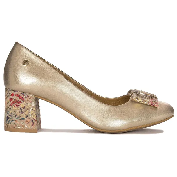 Maciejka to polska marka produkująca obuwie. Buty tej marki wykonane są z najwyższej jakości skór naturalnych, a to gwarancja komfortu, wygody i uniwersalności. Modele produkowane przez markę Maciejka wpisują się w najnowsze trendy, pozostając także w klasycznych ramach stylistyki. Priorytetem firmy jest zadowolenie klientek. A oto model spełniający te kryteria. Cholewka wykonana ze skóry naturalnej, licowej w kolorze złotym. Podeszwa to elastyczne, wysokogatunkowe tworzywo. Kwadratowy, niewysoki obcas, obszyty skórą welurową o bardzo ciekawym, metalicznym wzorze jest bardzo stabilny i w naturalny sposób wysmukla sylwetkę, a oprócz tego stanowi subtelną ozdobę tego modelu. Na palcach kolorowa kokardka z tego samego materiału, którym obszyto obcas. Wnętrze i wkładka również ze skóry naturalnej, co w dużym stopniu podnosi komfort noszenia. Na zewnętrznej stronie pięty niewielkie, metalowe logo marki. Do pary dołączony zapasowy komplet fleczków. Wysoki komfort użytkowania w połączeniu z efektownym wyglądem to cecha charakterystyczna tych butów. Jeśli więc cenisz sobie wygodę i oryginalność to ten wzór jest dla Ciebie. Jakość: I.