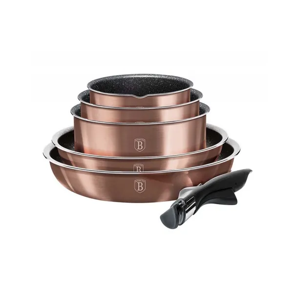 Najwyższej jakości zestaw garnków i patelni aluminiowych z unikalną powłoką granitową oraz odpinaną rączką w systemie Click it. Produkt renomowanej marki BERLINGERHAUS z linii Rose Gold. Przystosowane do wszelkiego typu kuchenek, także indukcyjnych.