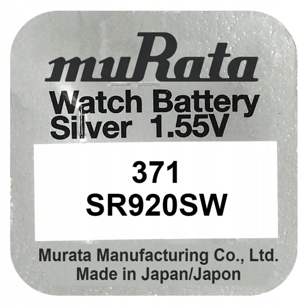 Parametry techniczne: Rodzaj: Zegarkowe - 371 / SR920SW Wymiary: wysokość: 2,1 mm, średnica: 9,5 mm Napięcie: 1.55V Producent: Murata Ilość: 1 sztuka w blistrze Inne oznaczenia: 370 G6 920 SB-BN SB-AN 280-51 GP370 GP371 171 537 V371 605 CX69 SR920W SR920SW SR69 LR920 AG6 Baterie wyprodukowane w Japonii. Baterie zegarkowe Murata to baterie srebrowo-tlenkowe. Znajdują zastosowanie w szerokiej gamie zegarków - od cyfrowych, wymagających ogniwa o dużych wymiarach, do najbardziej eleganckich zegarków damskich zasilanych bateriami o bardzo małych wymiarach. Tabelka zamienników dostępna jest tutaj.
