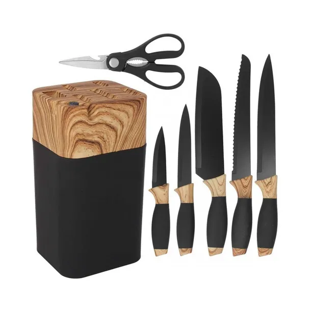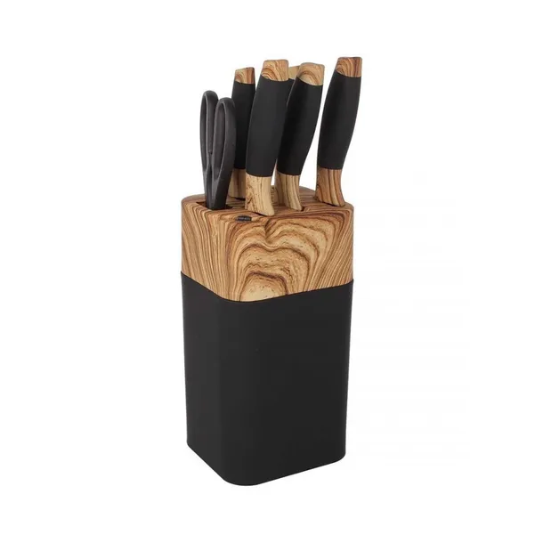Zestaw 5 noży kuchennych w stojaku. W zestawie nożyce kuchenne. Stojak posiada wbudowaną ostrzałkę pozwalającą w razie potrzeby naostrzyć noże.