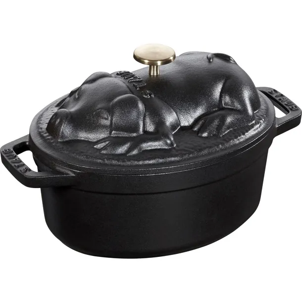 Choć nazwa francuskiego naczynia żeliwnego wskazuje, że nadaje się ono przede wszystkim do przygotowywania dań z wieprzowiny, świetnie sprawdzi się ono również w przypadku wszystkich innych rodzajów mięs. Ze swoim uroczym designem formowanym na kształt prosięcia garnek przepięknie prezentuje się na każdym stole zarówno w domu, jak i profesjonalnej restauracji. Owalna brytfanna ma średnicę 17 cm a jej optymalna objętość 1 l umożliwia przygotowanie dań dla 1 lub dwóch osób. Długo utrzymywane i równomiernie rozprowadzane ciepło gwarantuje delektowanie się posiłkiem sprawiając, że nie wystygnie on nawet podczas spokojnej, romantycznej kolacji. Efekt ten jeszcze bardziej potęguje wewnętrzna powłoka. Matowa emalia w kolorze głębokiej czerni lub uniwersalnej szarości sprawia, że temperatura zachowana jest nie tylko wewnątrz, ale i na brzegach naczynia. Wpływa ona również na zachowanie naturalnego smaku i zapachu potraw. Na wybitną praktyczność garnków żeliwnych Staub wpływa również fakt, że doskonale nadają się one do wszystkich rodzajów kuchenek, w tym indukcyjnych. Z tymi niepowtarzalnymi naczyniami z serii La Cocotte przygotowanie nawet najprostszych potraw stanie się prawdziwą, kulinarną sztuką. CECHY SZCZEGÓLNE Idealny do smażenia i powolnego gotowania różnego rodzaju mięs, ryb oraz warzyw Matowa emalia wewnętrzna szczególnie dobrze sprawia się do chrupiącego opiekania i charakteryzuje się wybitną wytrzymałością Do wszystkich rodzajów kuchenek, również indukcyjnych, piekarników i grilla WYMIARY Średnica: 17 cm Średnica dna: 14.8 cm Wysokość (bez pokrywki): 10.6 cm Wysokość: 13 cm Długość: 22.5 cm Pojemność: 1 ltr Masa: 2.