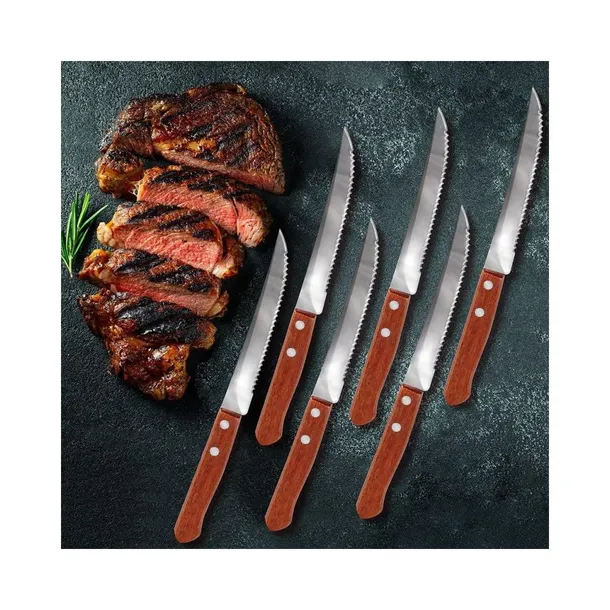Zestaw sześciu noży do steków z ząbkowanym ostrzem. Solidne uchwyty zapewnią wygodę i komfort podczas użytkowania. Przydatne podczas grillowanie oraz w domu.
