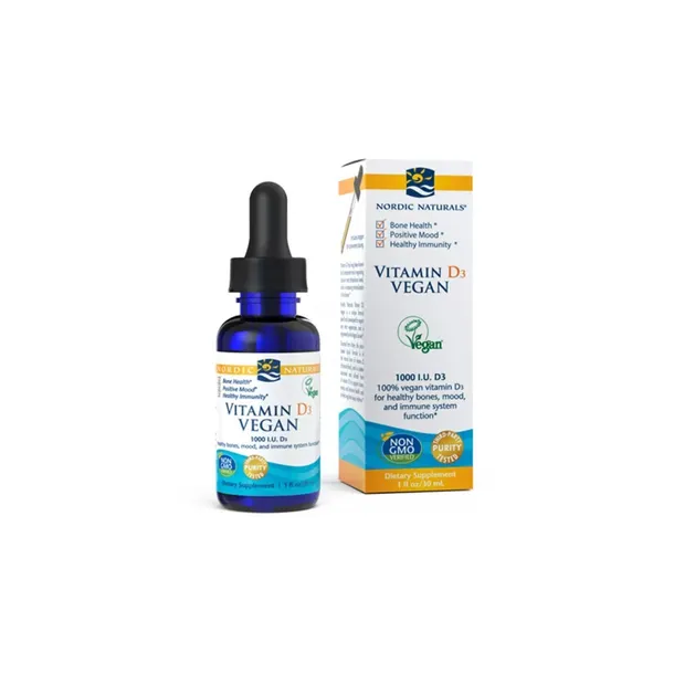 Suplement diety Witamina D3, Wegańska, 1000 IU od Nordic Naturals zawiera witaminę D3 (cholekalcyferol) i jest dostępny w formie płynu. Taka postać podania jest dobrym wariantem dla osób, które nie lubią połykać tabletek bądź kapsułek. Produkt jest odpowiedni dla wegan i wegetarian, a także dla tych osób, które poszukują suplementów o najwyższej jakości. Jeśli chcesz sprawdzić inne preparaty Nordic Naturals, prosimy o kliknięcie zakładki Producenci i wybranie tej marki.