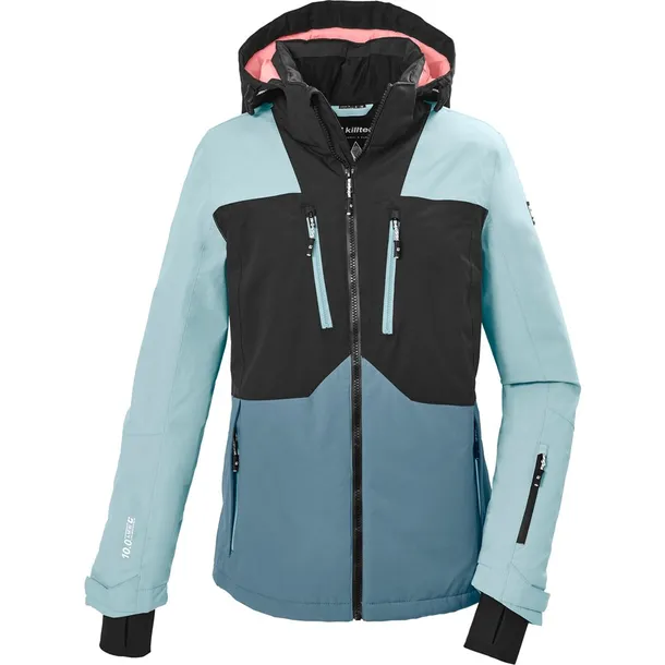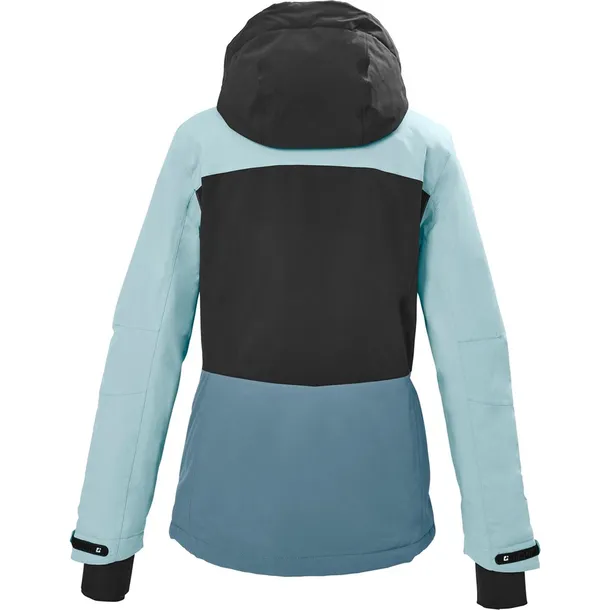 Damska kurtka narciarska Killtec, z kolorowym wzorem, przyciąga wzrok na stoku. Dzięki wodoodpornemu zamkowi błyskawicznemu i klejonym szwom jest wiatroszczelna i wodoodporna, a jej wodoodporność wynosi 10 000 mm słupa wody. Jednocześnie jest oddychająca, a jej przepuszczalność pary wodnej wynosi 3000 g/m²/24h. Regulowany pas śnieżny pokryty jest antypoślizgową gumową powłoką. Mankiety, dół i kaptur są regulowane. Elastyczne mankiety z otworami na kciuki u dołu rękawów zapobiegają przedostawaniu się zimna i wiatru. Liczne kieszenie oferują dużo miejsca na karnet narciarski, gogle, telefon i inne niezbędne rzeczy. Kurtka jest impregnowana wysokiej jakości, regenerującym Teflonem EcoElite™. Ten impregnat tekstylny jest pochodzenia roślinnego i biologicznego i charakteryzuje się niefluorową technologią ochrony przed plamami, która odpycha plamy na bazie wody.