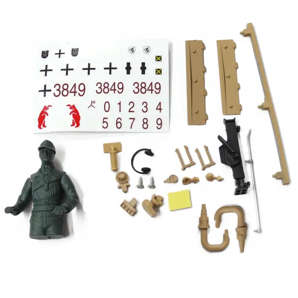 Zestaw zawiera: ramka z akcesoriami ( podnośnik, szekle, naklejki, itp) w komplecie figurka czołgisty