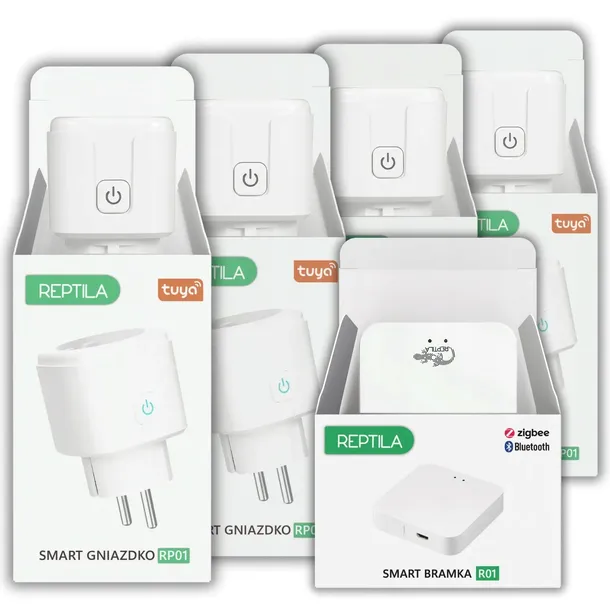 Zestaw 4 x Inteligentne gniazdko z pomiarem poboru mocy RP01 + Brama R01 pracujący w systemie TUYA z funkcją łączności ZigBee marki Reptila