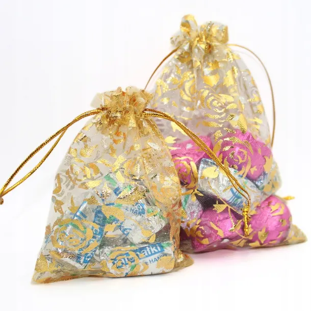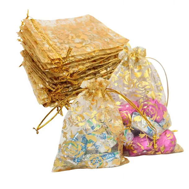 ⭐⭐50 szt WORECZKI Z ORGANZY MAŁE TOREBKI 10x12 NA PREZENT ŚLUB ŚWIĘTA ZŁOTE⭐⭐