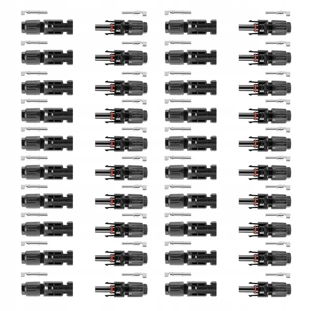 Wysokiej jakości kompletny zestaw 50 wtyczek MC4 "+" i "-" (męski i żeński). Zestaw przeznaczony do stosowania na kablu solarnym. Konektory służą do łączenia paneli fotowoltaicznych.