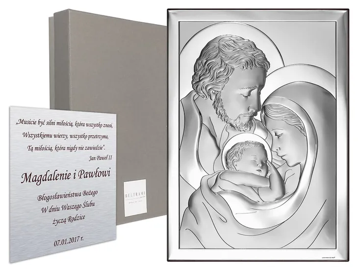 Ekskluzywny srebrny obrazek włoskiej produkcji, stworzony przez firmę, lidera w produkcji srebrnych wyrobów pamiątkarskich. Obrazek przedstawia ŚWIĘTĄ RODZINĘ. Całość stanowi wyjątkowy prezent lub pamiątkę na specjalną okazję jaką jest Ślub, Chrzest Święty czy I Komunia.