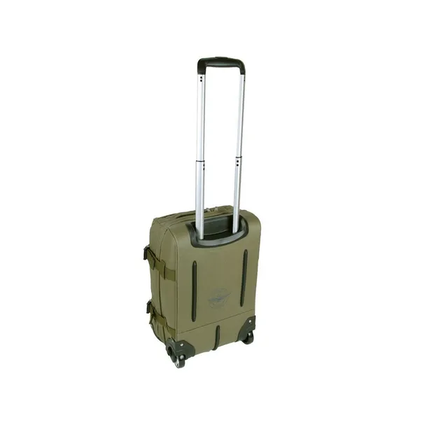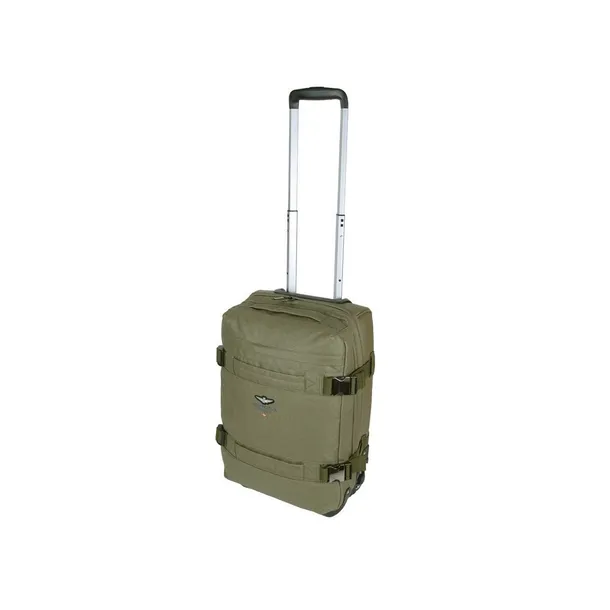 Mała torba podróżna na dwóch kołach włoskiej marki Aeronautica Militare z kolekcji NEW CITY. Spełnia normy bagażu kabinowego większości linii lotniczych.Wykonana z bardzo wytrzymałej, wysokiej jakości wodoodpornego woskowanego płótna. Posiada teleskopowo wysuwany stelaż, dwa stabilne koła, wzmacniane dno. Wygodne uchwyty z boku i u góry ułatwiają umieszczenie jej w bagażniku auta lub zdjęcie z lotniskowego transportera. Wnętrze komory głównej,wyłożone podszewką podzielone jest na dwie części. W jednej znajdują się regulowane pasy. W drugiej, pod zamykaną na suwak klapą znajdujesię miejsce na garderobę. System regulowanych bocznych pasów pozwala na dopasowanie kształtu torby w zależności od ilości rzeczy które aktualnie zostały spakowane, tak aby bezpiecznie je transportować.Przód zdobi charakterystyczne logo Aeronautica Militare Frecce Tricolori.Torba zaprojektowana w praktyczny i funkcjonalny sposób cechuję się niewielką wagą i starannym wykończeniem.