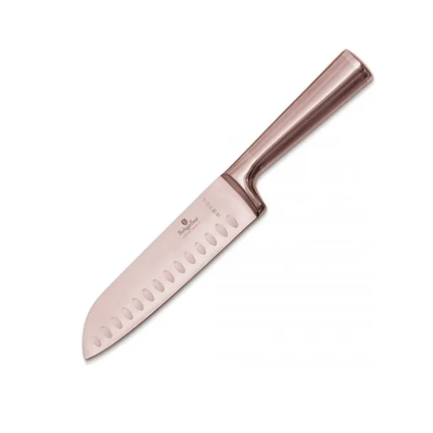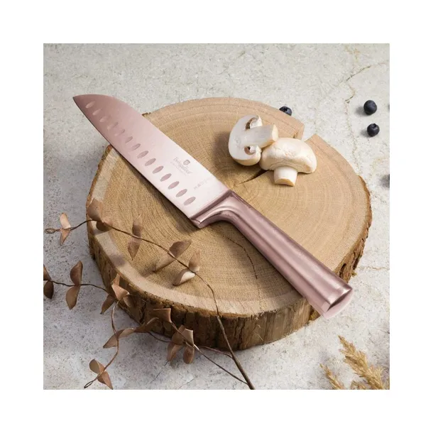 Nóż Santoku Berlinger Haus to wszechstronny nóż kuchenny, który łączy w sobie tradycyjny japoński design z nowoczesną funkcjonalnością. Wykonany z wysokiej jakości stali nierdzewnej 3CR13, charakteryzuje się dużą odpornością na korozję, trwałością oraz długo utrzymującą się ostrością. Jest idealnym wyborem do precyzyjnego krojenia, siekania i szatkowania, zarówno warzyw, jak i mięsa czy ryb.