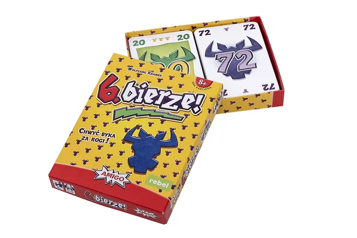 Wybierz, odkryj, zagraj! „6. bierze” to niezwykle prosta, a jednocześnie maksymalnie wciągająca gra karciana, w której staramy się pozbyć z ręki wszystkich byczych głów. Na samym początku otrzymujemy po 10 kart, które następnie zagrywamy w 1 z 4 rzędów. Pamiętaj jednak, że nazwa gry nie jest przypadkowa: ten, kto dołoży 6. kartę do rzędu, musi go zebrać, a każdy byk na zebranej karcie oznacza niechciane punkty karne!Na czym to polega?W każdej rundzie wszyscy wybierają po 1 karcie z ręki i kładą ją zakrytą przed sobą na stole. Karty są odkrywane, gdy wszyscy dokonają wyboru.Gracz, który zagrał kartę o najniższej wartości, dodaje ją na koniec 1 z 4 rzędów. Następną dodaje gracz, który zagrał kartę o drugiej najniższej wartości, i tak dalej aż wszystkie zagrane karty zostaną dodane do rzędów. Przy dokładaniu obowiązują 2 zasady: 1. Wartości kart w każdym z rzędów muszą zawsze rosnąć od lewej do prawej.2. Karta musi być zawsze dodana do rzędu, który kończy się kartą o najbliższej niższej wartości.Wszystko idzie gładko, dopóki możemy dołożyć kartę do 1 z 4 rzędów. Problemy zaczynają się, gdy rząd jest pełny albo zagramy kartę, która nigdzie nie pasuje. W obu tych przypadkach musimy wziąć karty ze stołu i dodać je do swojego stosu byków. Gra kończy się, gdy któryś z uczestników zgromadzi na swoich kartach 66 byków. Zwycięża ten, kto ma ich najmniej!